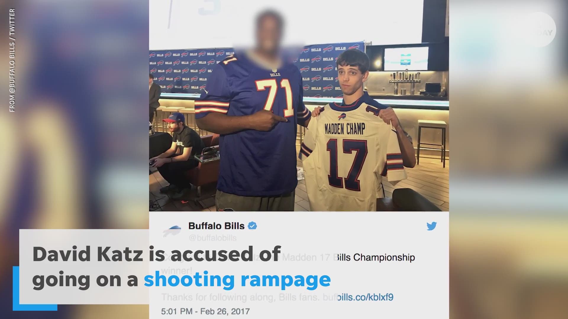 David Katz aurait selon les informations du Los Angeles Times ouvert le feu après. A tweet by the Buffalo Bills in February 2017 listed David Katz as the winner of their Madden 17 Championship held at 716 Food and Sport restaurant in downtown Buffalo. The competition was held in a gaming bar that shares space with a pizzeria.
